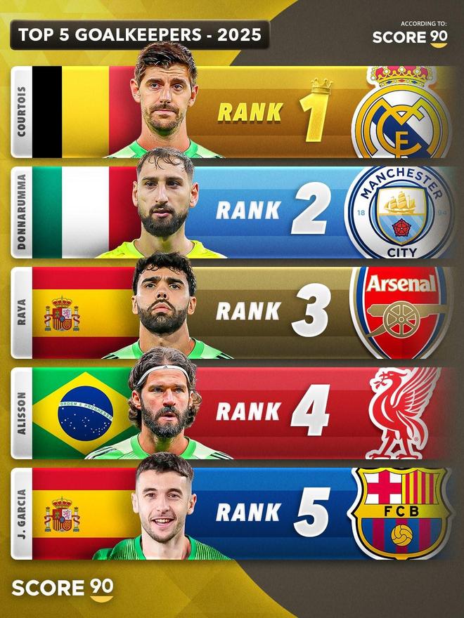 北京时间12月31日,Score90公布了根据他们的数据统计选出的2025年度前5名门将,其中库尔图瓦排名第一,多纳鲁马、拉亚分列二三。